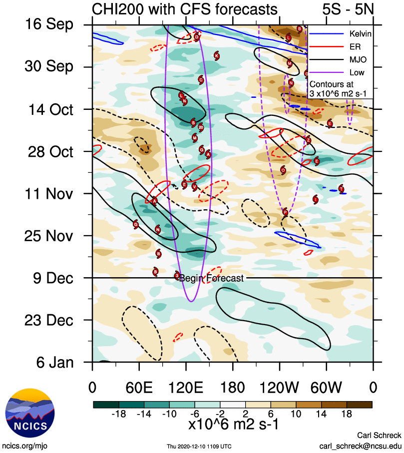 EPS mean forecast 200mb velocity potential time-longitude through February 6, courtesy ECMWF.int