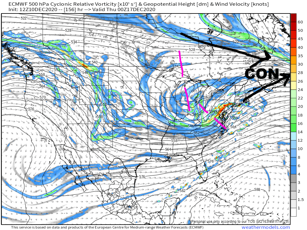 The start of the loop appears to have so much potential for a big, amplified storm. Unfortunately, the trough is not ejecting in one piece. A potent trailing shortwave along with some confluence ahead of the lead shortwave shears it out. The trailing shortwave leads to a prolonged event, especially for southern New England where there may be a bit more interaction between the polar jet energy and the trailing shortwave. In addition to the storm being relatively strung out it’s simply not that cold: