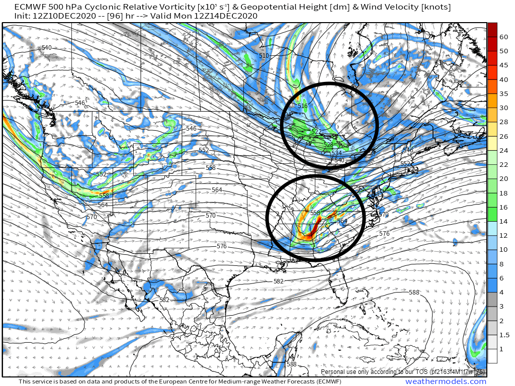 The result will be a weak attempt at a primary low into the Ohio Valley, and a weak attempt at a coastal. Neither will be strong and there won’t be a ton of QPF to play with, with the most QPF over the southeast and lower Mid Atlantic where the shortwave will still be stronger and where PWATs are higher. There may also be a relative uptick over PA, NY and southwestern New England as the vort max rounding the PV adds a bit of lift and improves jet support while the weak coastal makes its closest pass: