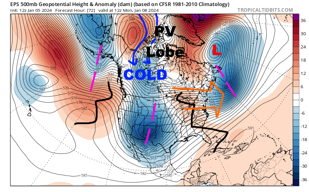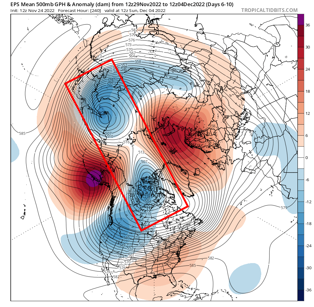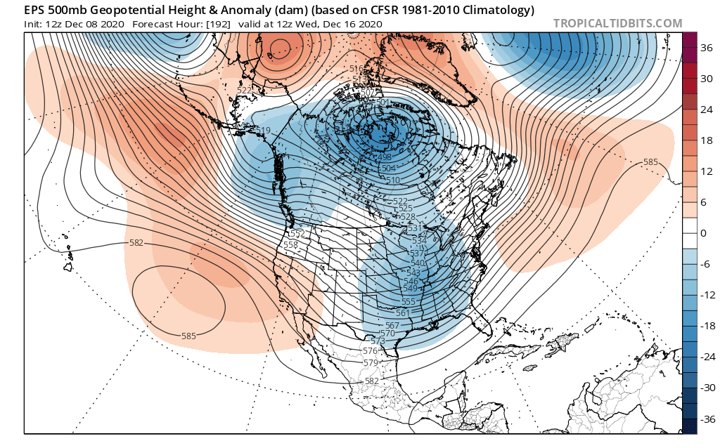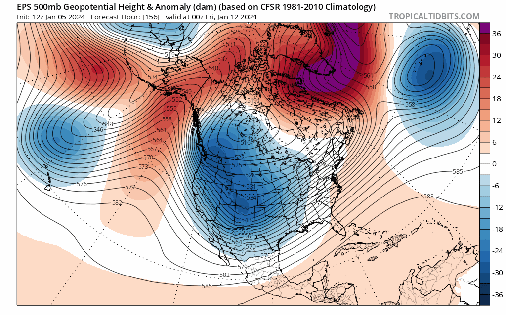 EPS mean forecast 500mb heights and anomalies valid 12z Monday, Jan 8th