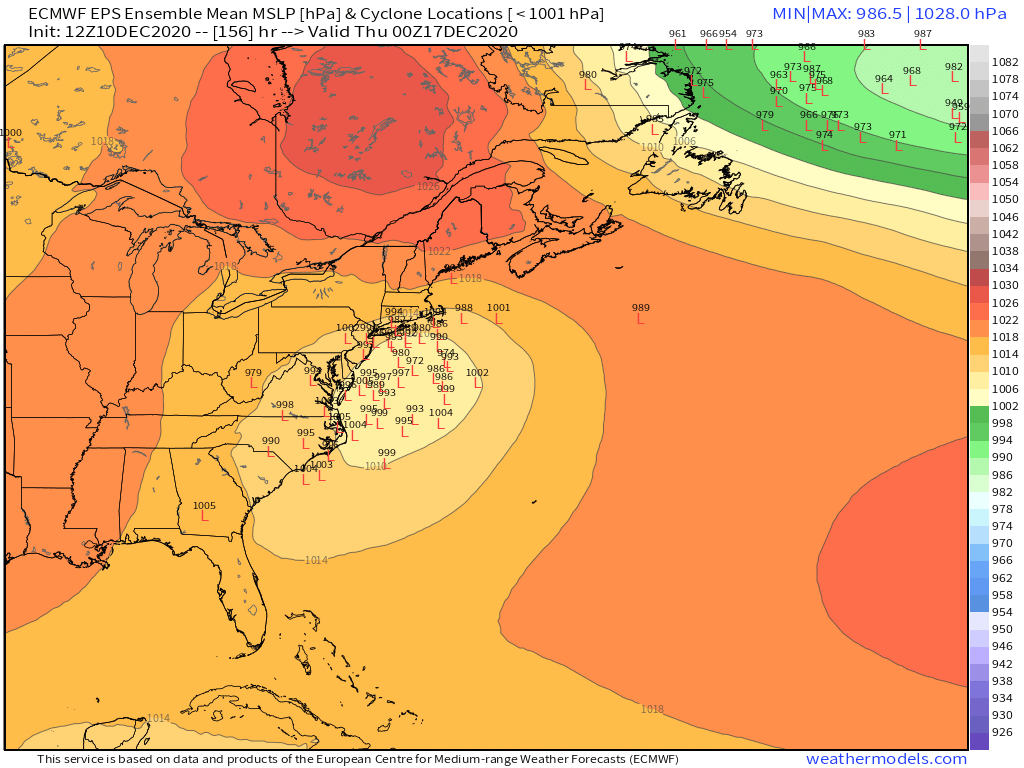 European ensemble member forecast low locations and intensity valid 1 AM Wednesday