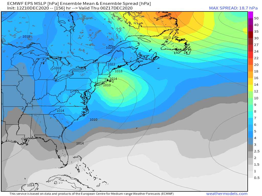 While there’s great agreement on a general low track off the East Coast next Wednesday – Thursday, there is still a good bit of spread in both track and speed, and intensity at all points. This likely has a lot to do with how well this shortwave interacts with the polar stream, and how strong the Monday system becomes, since it turns into the 50/50 low.