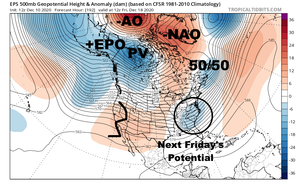 The Atlantic pattern remains decent through next weekend and the AO stays negative…however, the EPO rises and the PNA tries dipping, which will try to flood the CONUS with Pacific air and make it harder to see enough northern stream interaction for a phase or good winter storm. How the Wednesday-Thursday storm plays out will also impact the pattern for Friday’s storm, and Friday’s storm will have an impact on the Sunday storm. See a pattern? This is fun.