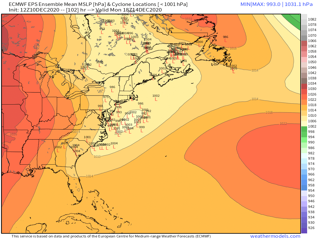This all leads to a robust low pressure tracking across the Ohio Valley and then re-developing off the Mid Atlantic coast, with a strong high pressure over southeast Canada: