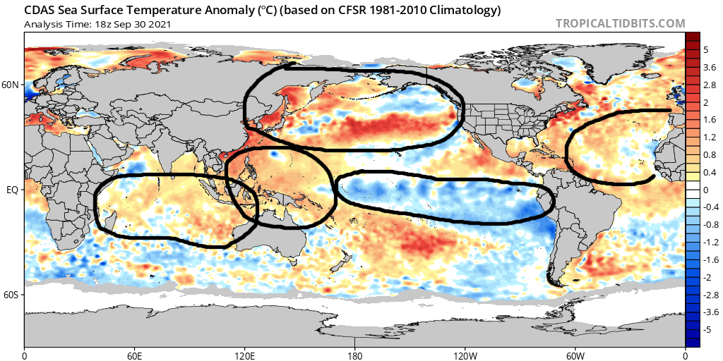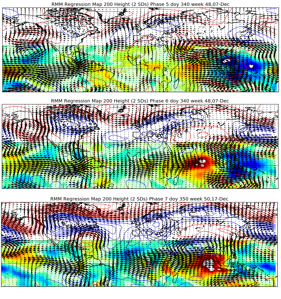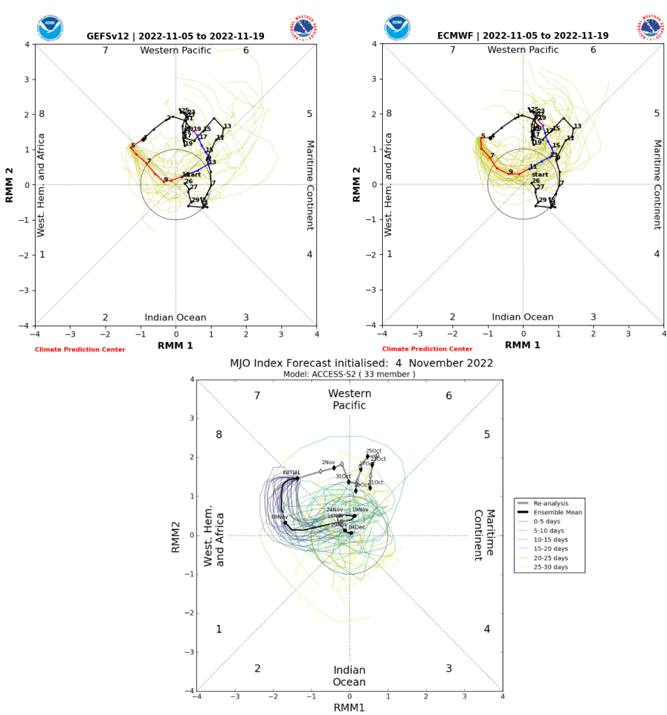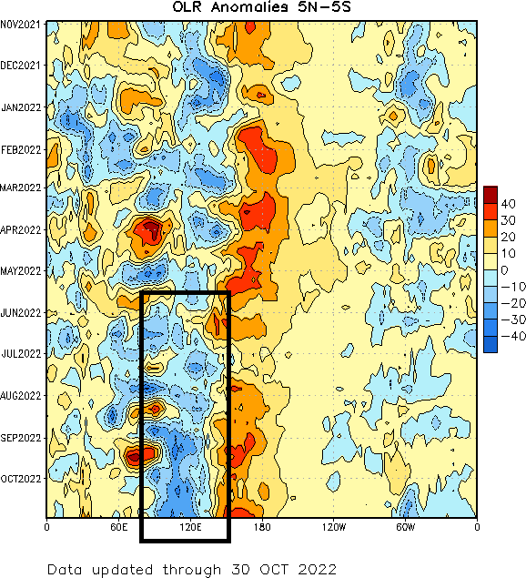 The RMM plots have had a hard time tracking this current MJO as it’s constructively interfering with lower frequency forcing near 120-150E. However, it seems there’s still a coherent MJO in there that’s currently in phase 5 and may get into phase 6 or 7 next week. You can see how the lift really intensified over the Indian Ocean last month as the MJO approached the low frequency forcing near Indonesia…and how it seems the MJO is now emerging on the other side towards the western Pacific: