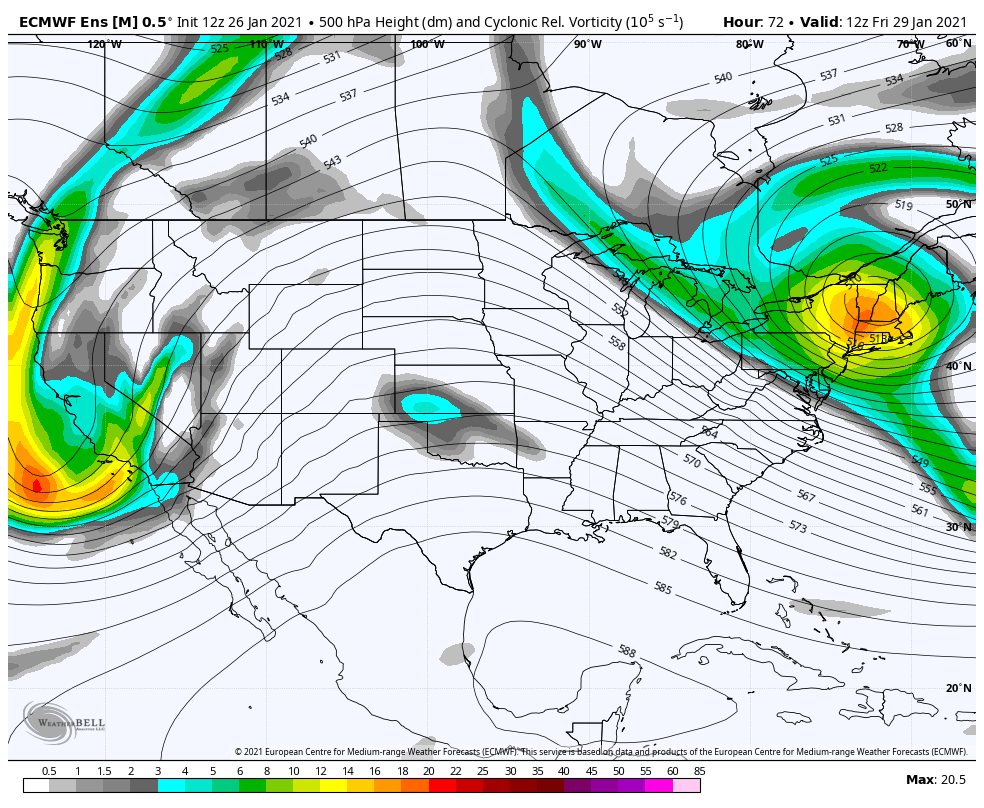 My thoughts on this one are that the Atlantic side is stellar, and the shortwave ejected east across the country is strong. There should be a decent Nor’easter with snow for at least part of the Northeast or Mid-Atlantic. If the Pacific side isn’t as ideal, with the PV centered a bit to the west and the ridge axis southwest of what’s preferable, though some improvements may still occur there based on current trends. These improvements could really up the ante for snow somewhere if they occur.