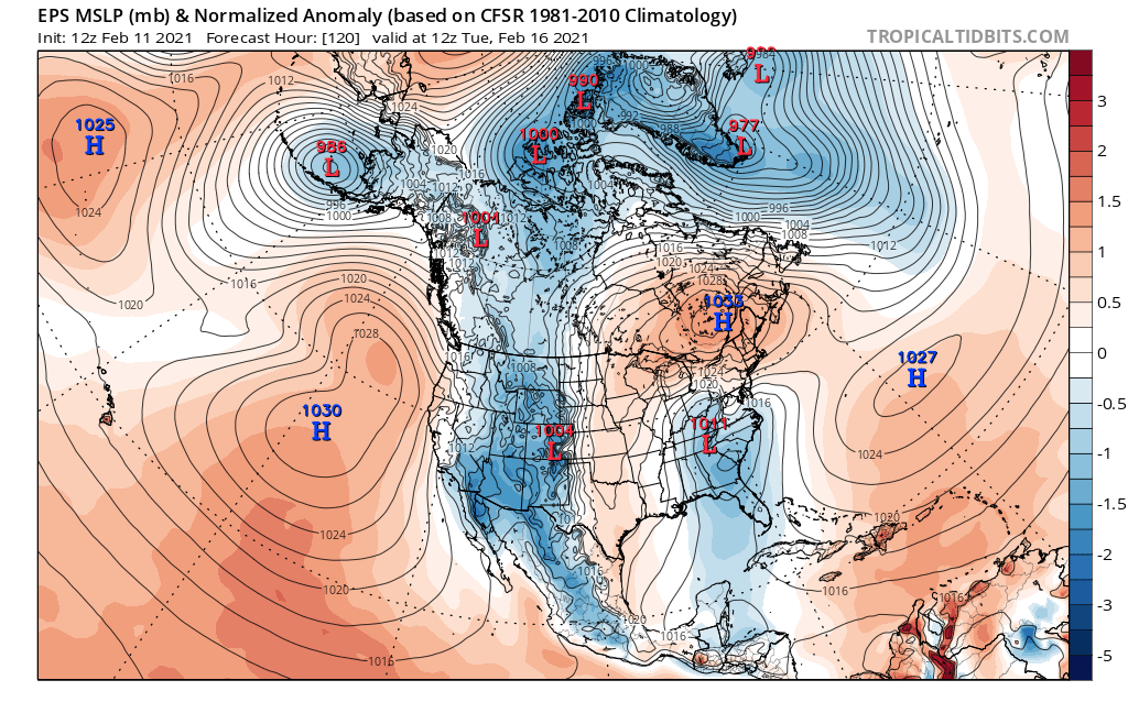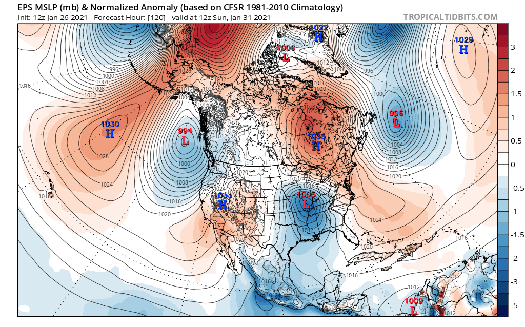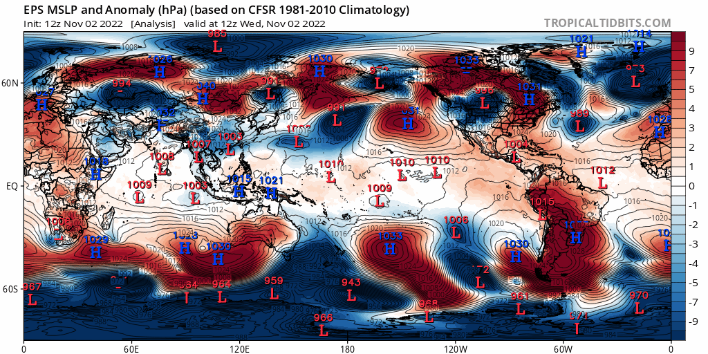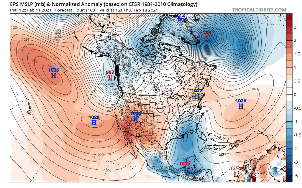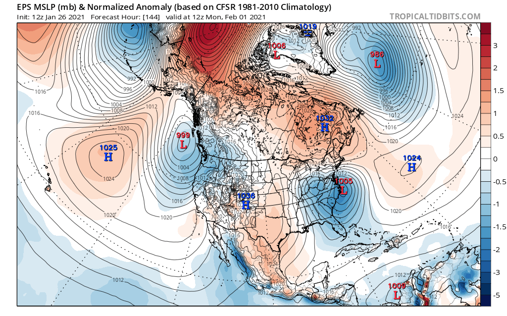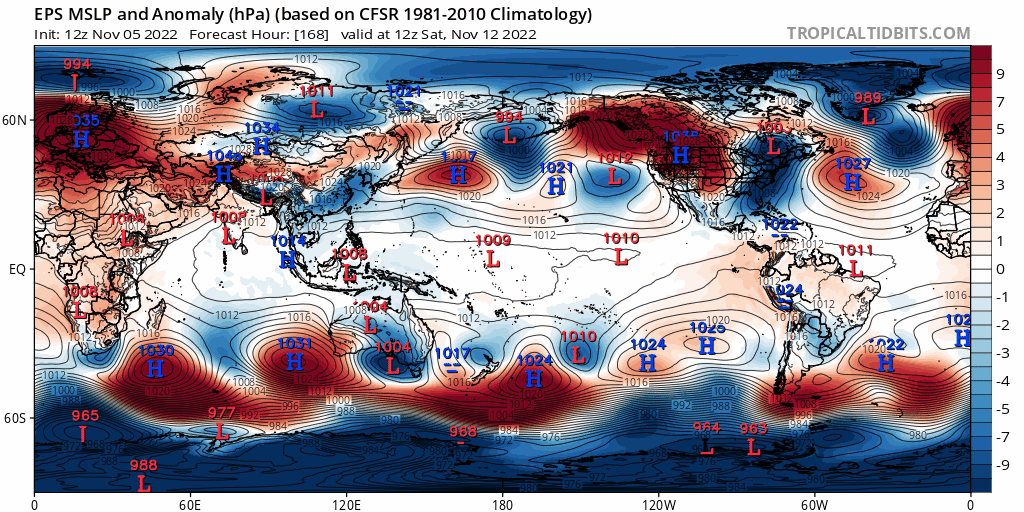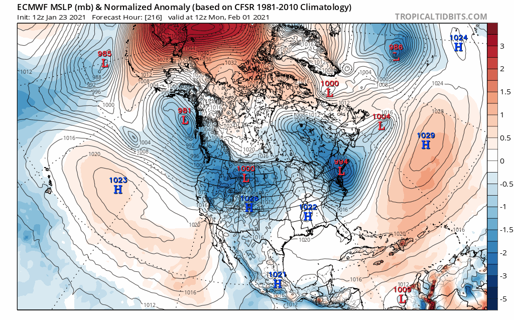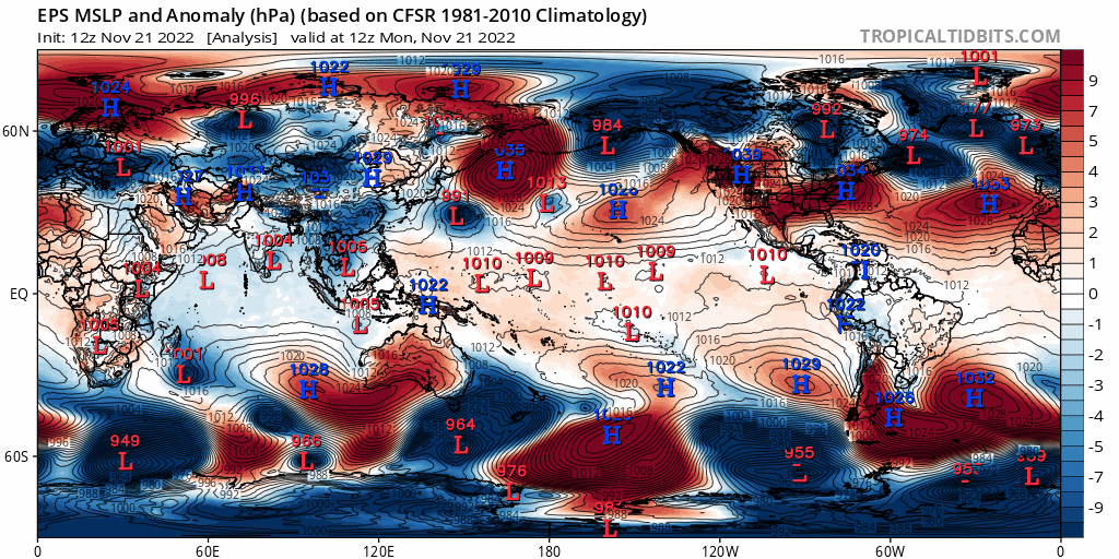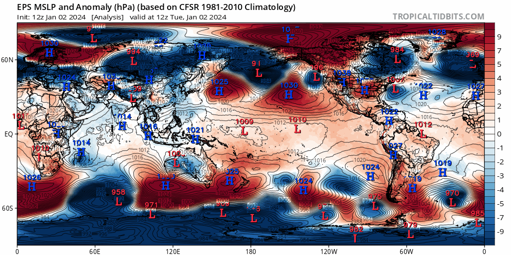 Loop of analyzed and forecast sea level pressure anomalies from the December 25th European Ensemble run. https://www.tropicaltidbits.com/