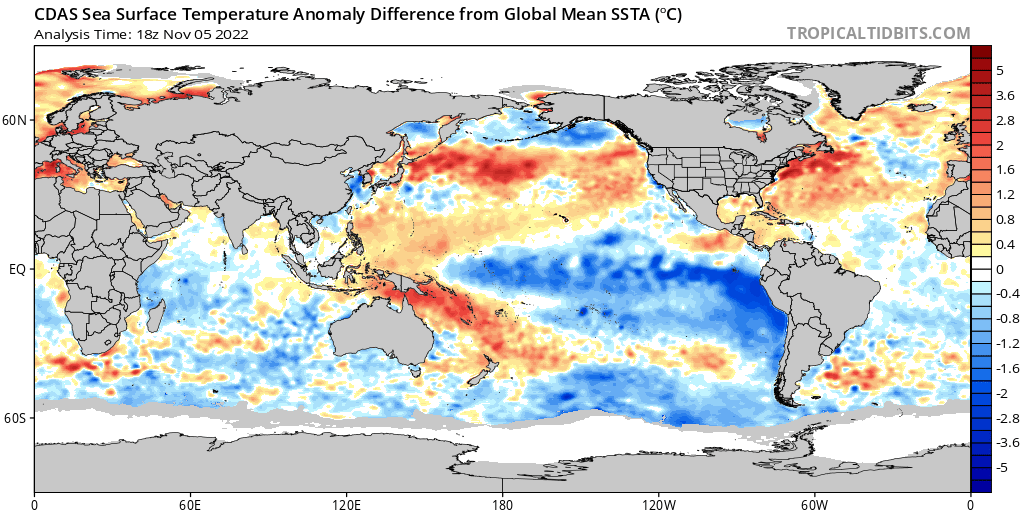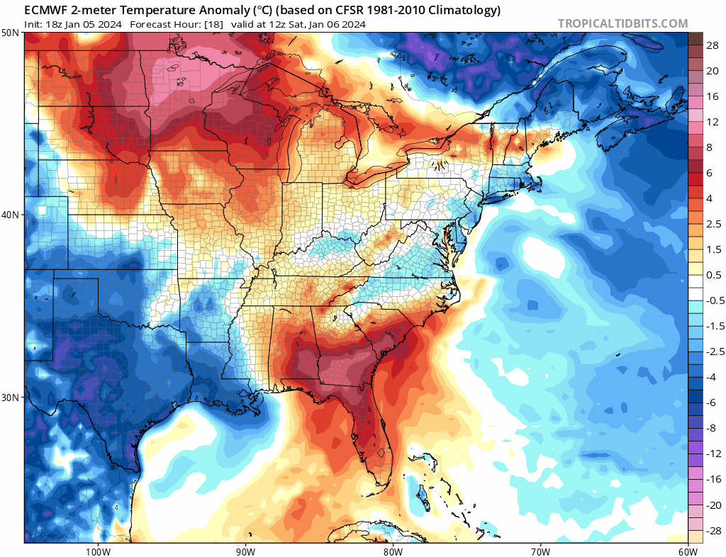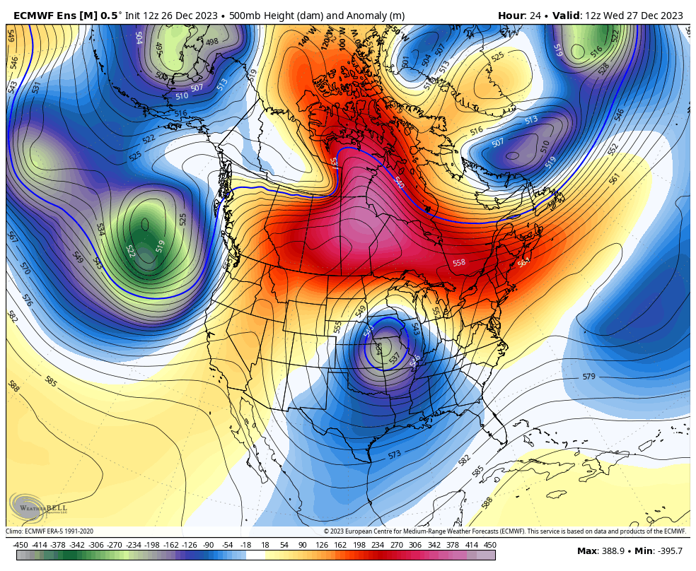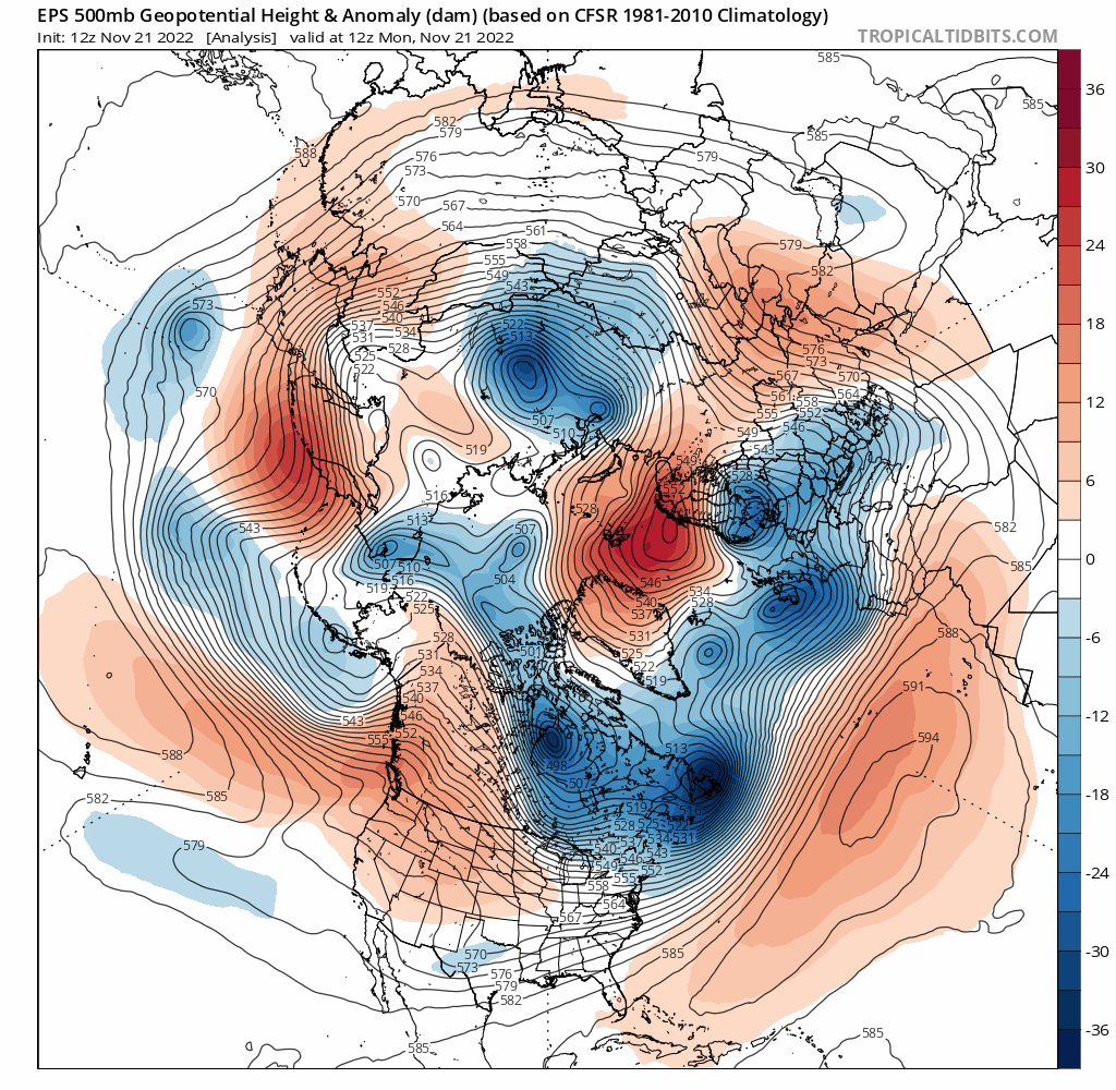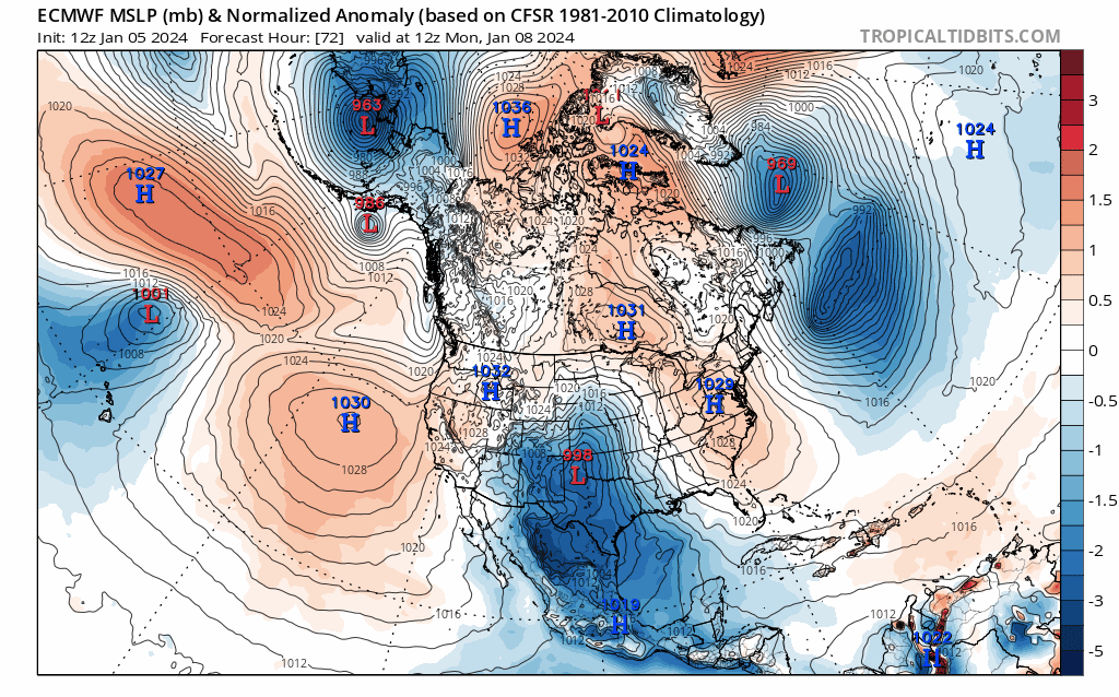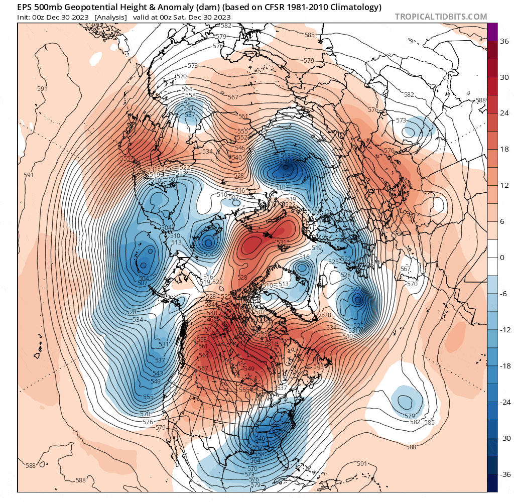 Loop of analyzed and forecast sea level pressure anomalies from the December 25th European Ensemble run. https://www.tropicaltidbits.com/