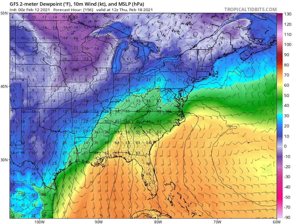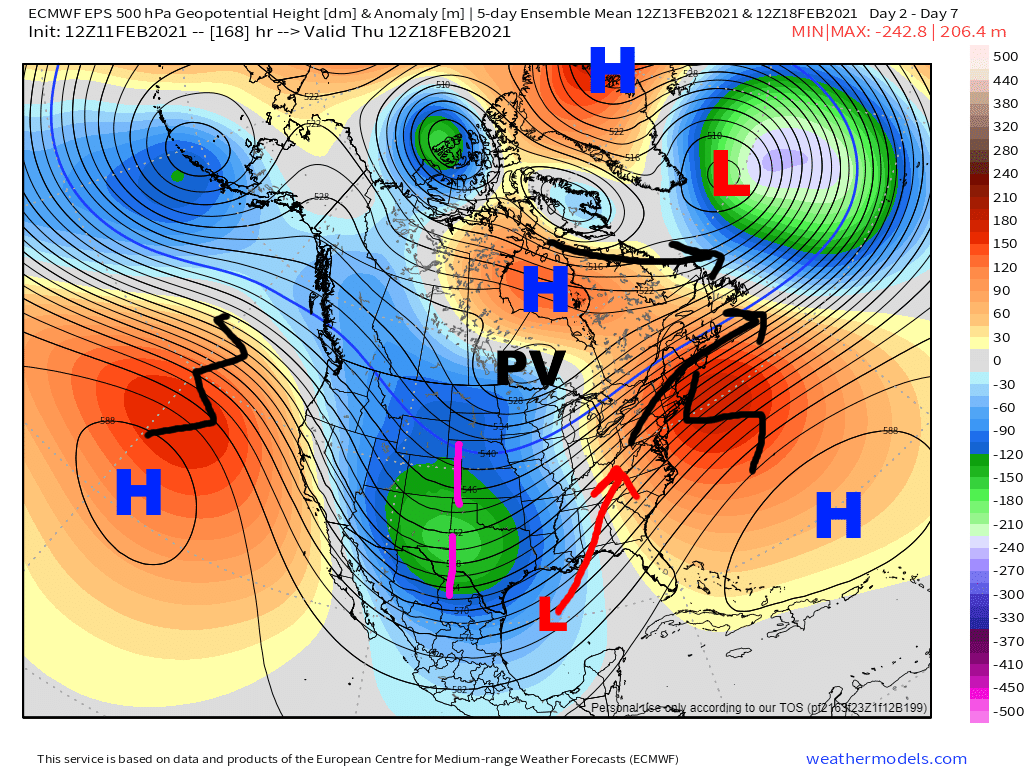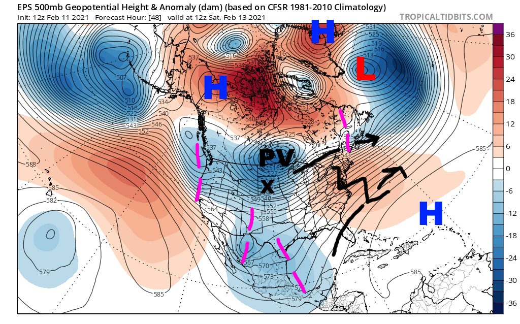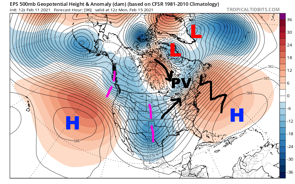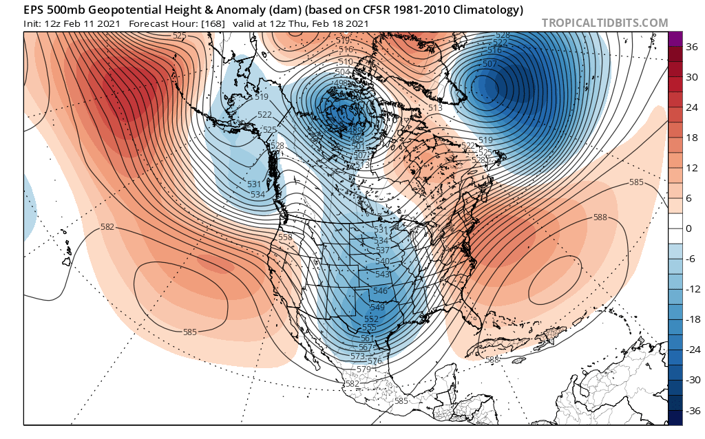 This loop of the GFS helps show the continued cross polar flow into Canada, and how the retrograding -NAO helps shove the tropospheric polar vortex towards the CONUS this weekend and next week, bringing a cold snap to much of the Lower 48. With the Pacific blocking likely continuing for the forseeable future, the model shows Arctic air reloading towards the end of the run in mid-late February.