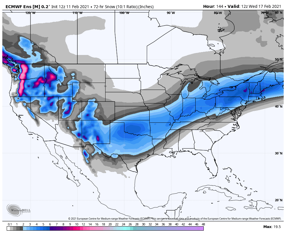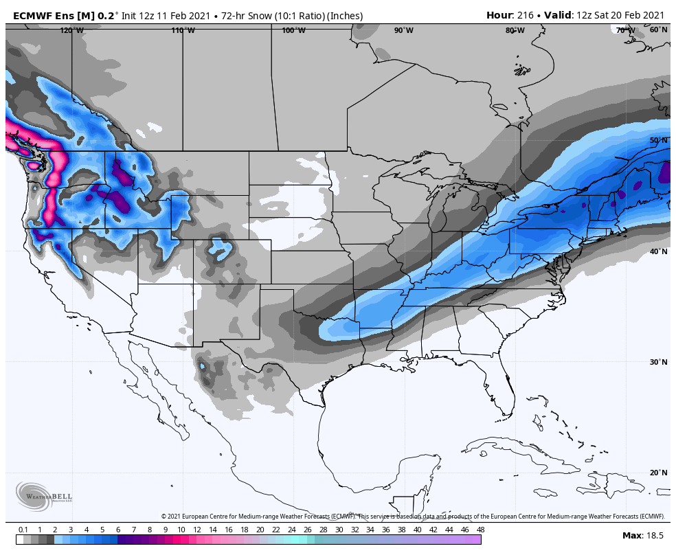 Note how the ensemble mean snow swath is actually fairly similar on the southern edge to Monday – Tuesday in the Northeast, but definitely has the heaviest swath located even farther inland.