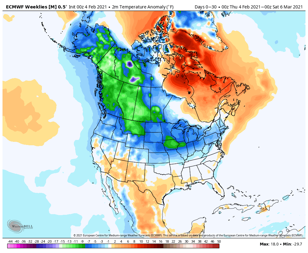 Basically, the US will lean cold for much of February. There will be a baroclinic zone across the southern / eastern US, though the cold will seep south and east at times given the -NAO and the quality of the cold that will be available. The Arctic air may lead to near to below average precipitation for a lot of the CONUS (save for perhaps the southeast/east coast), but the pattern will stay at least somewhat active given the baroclinic zone and hints of a subtropical jet. The GEFS and EPS weekly forecasts for the next 30 days speak for themselves: