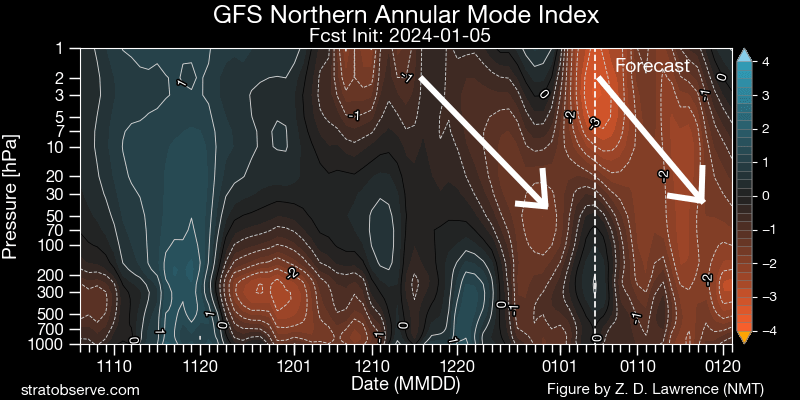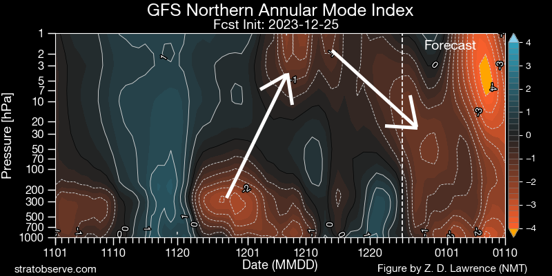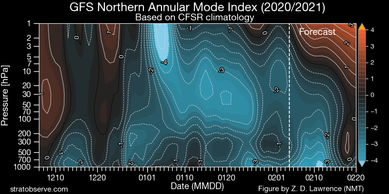 GFS analyzed and forecast Northern Annular Mode (NAM/AO) index time-height plot, courtesy stratobserve.com