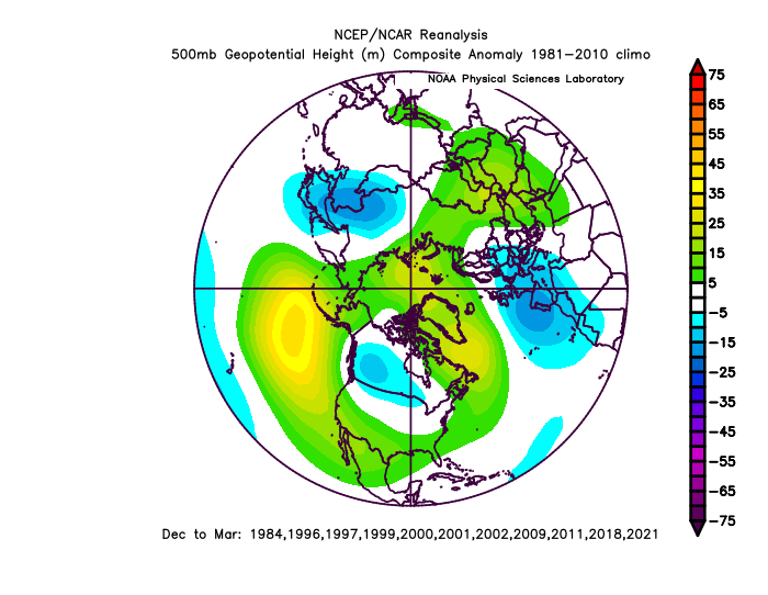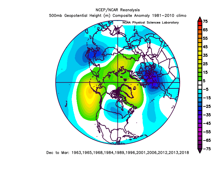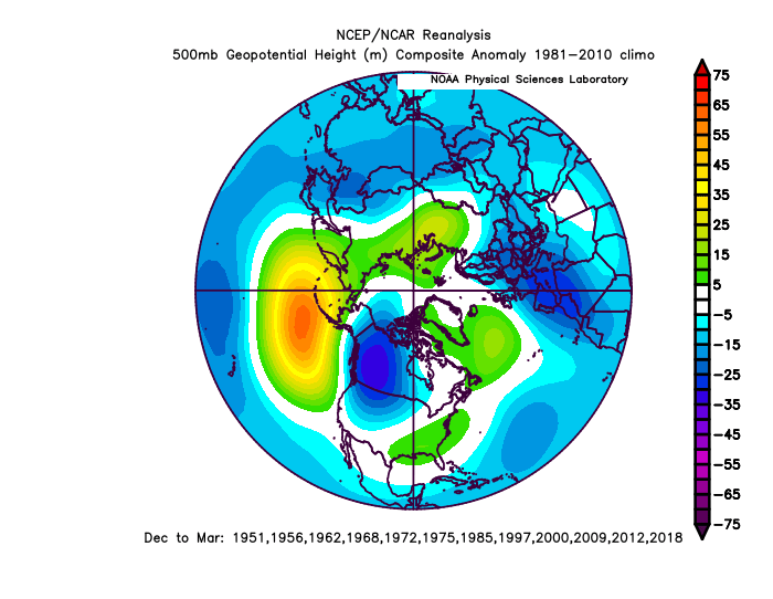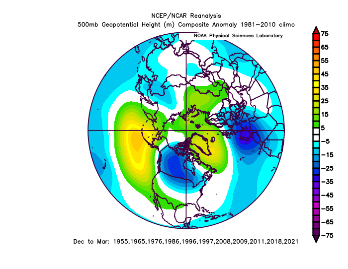 The pattern is pretty delectable on the Atlantic side. A strong -AO, -NAO, and 50/50 low. The -NAO and 50/50 low coax that strong confluence over southeast Canada, supporting a surface high pressure that forces the Miller B coastal to form. The tropospheric PV and 50/50 low, which was a lobe that broke off from the PV, mean there’s actual cold air available to tap, unlike last weekend when a robust Nor’easter produced more rain than snow. The Pacific pattern isn’t ideal…the ridge axis is a little southwest of preferable and the polar vortex is a little west/northwest than an ideal location. So, this would likely act to limit any threat in the Southeast and lower Mid-Atlantic. But, the Atlantic blocking and cold air over Canada being so robust would pretty much guarantee snow from much of PA and northern NJ into NY and New England, assuming there’s a storm.