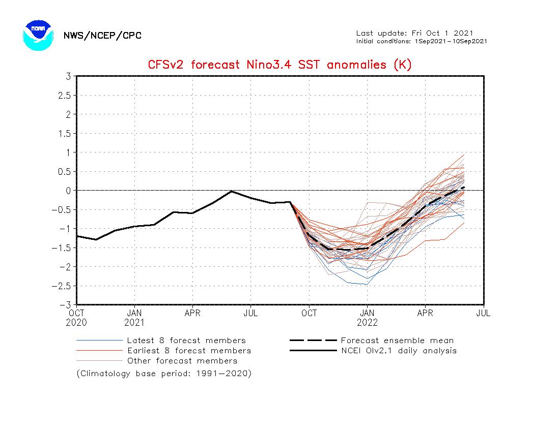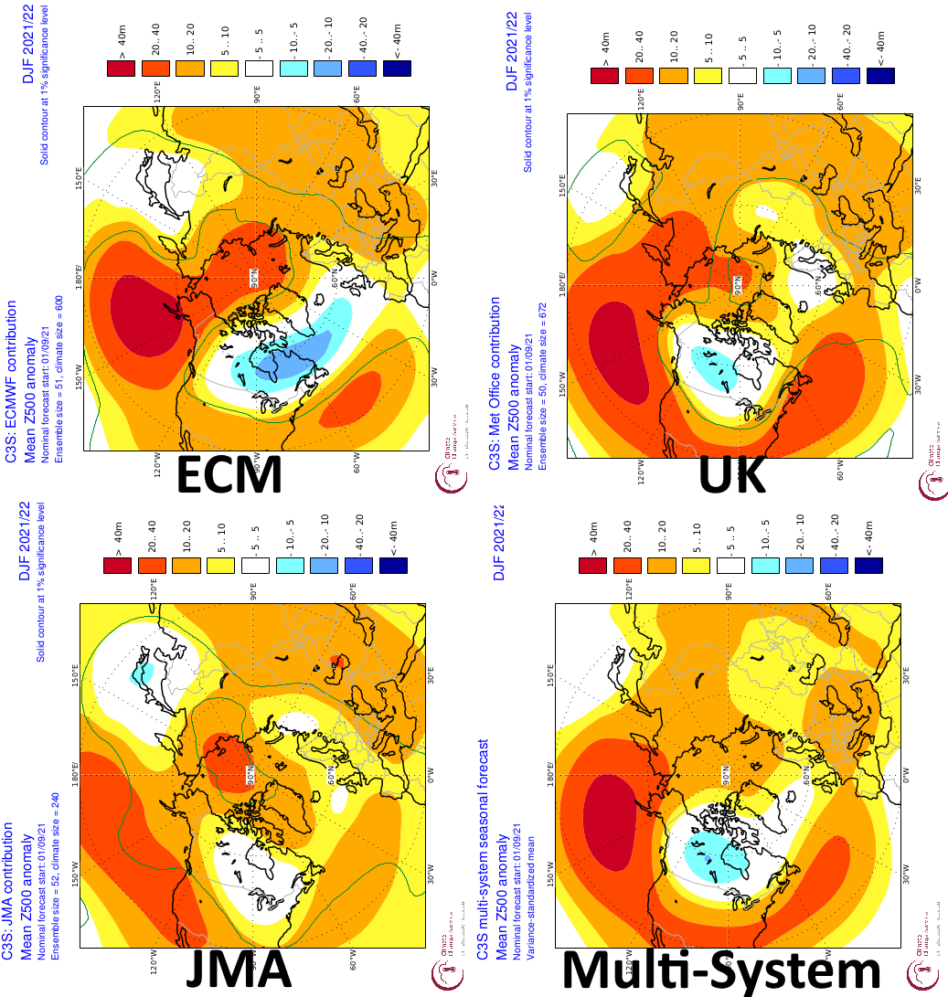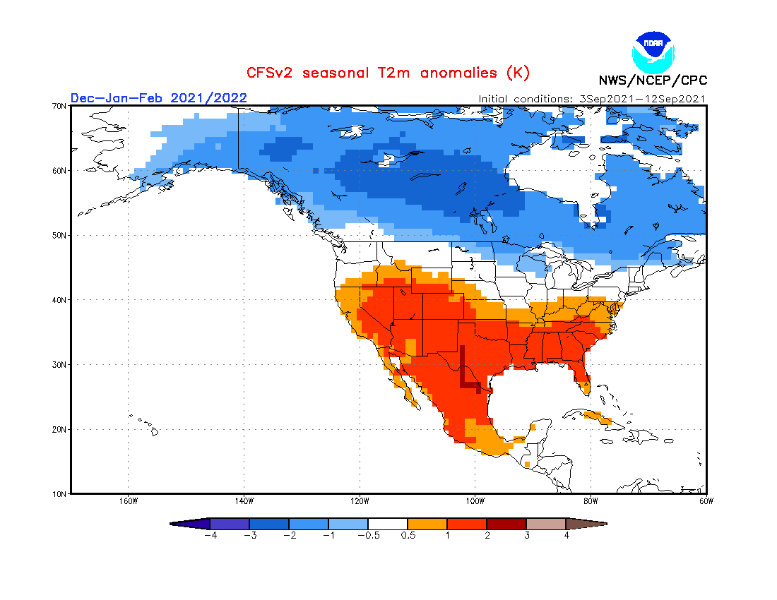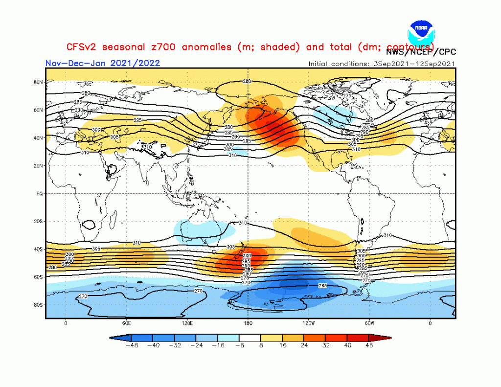 Recent CFS runs valid December – February 2021-22: 700mb height and temperature anomaly forecasts