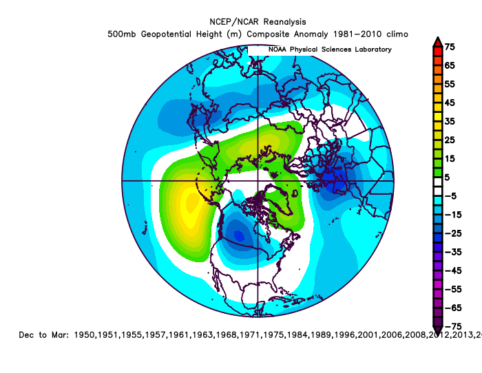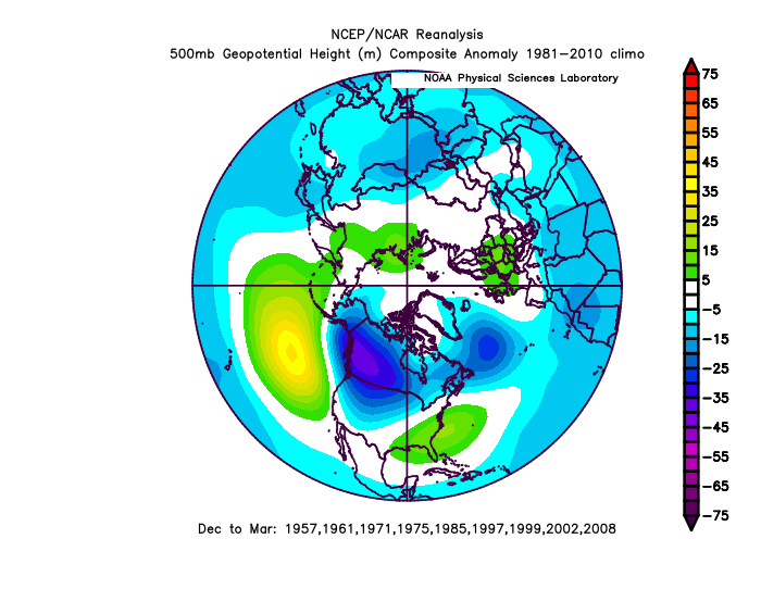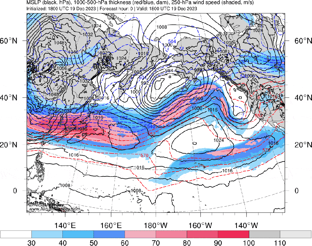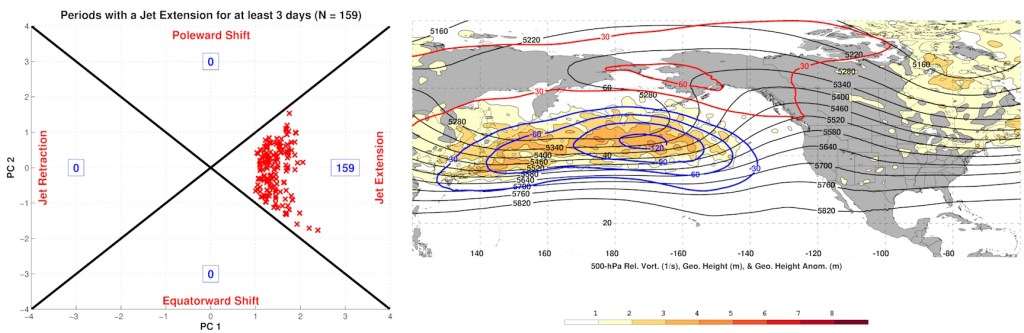 A significant influence on the Pacific jet stream is East Asian Mountain Torque (EAMT). Remember that big cold blast in Siberia earlier this month? The Arctic high associated with that dropped across eastern Asia (and is still doing so early in the above loop). This denser airmass and higher pressure east of the Himalayas puts a torque against the planet’s rotation, slowing it down an imperceptible amount. To conserve momentum, this is compensated for by speeding up the jet stream over the Pacific…promoting stormier conditions over the northern Pacific. The Rockies can have a similar affect on the jet stream over the north Atlantic.