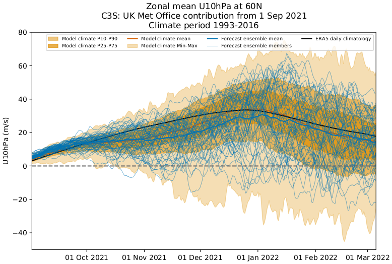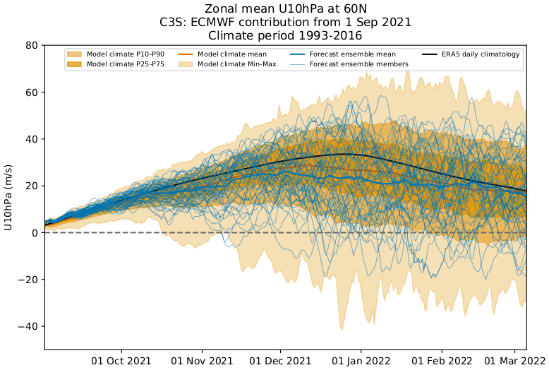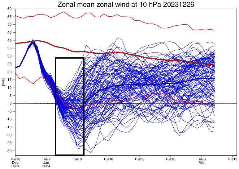 EPS member 10mb mean zonal wind forecast through mid February