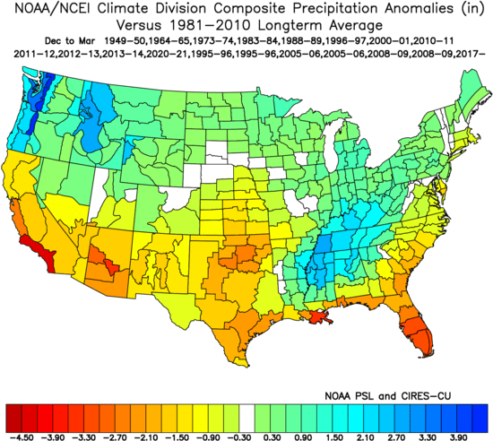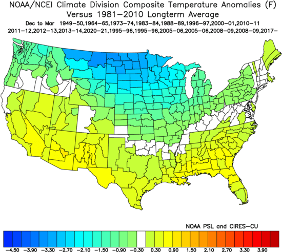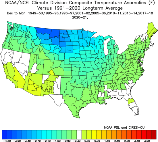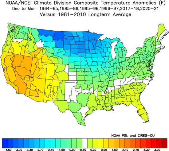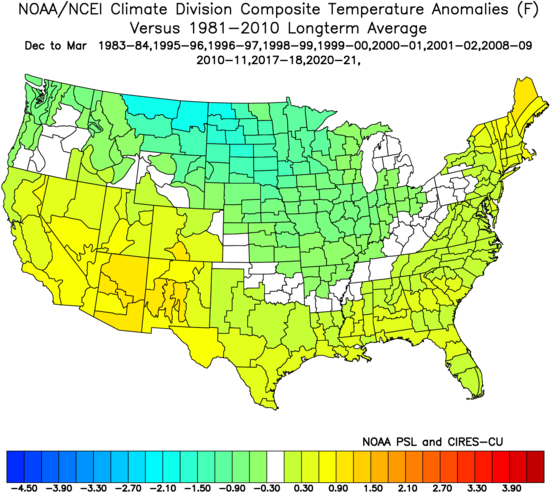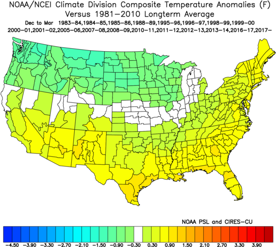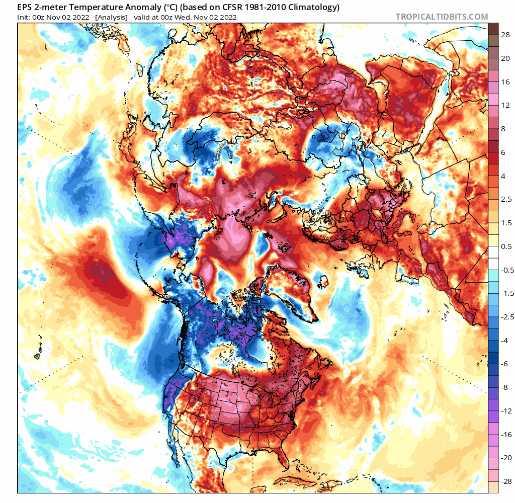 Outside of some of the highest elevations out west, the Plains where a winter storm is ongoing, and the highest elevations of Upstate NY and northern New England there is no snow cover in the Lower 48. Southern Canada isn’t in much better shape. Here is the departure from normal snow cover across the CONUS: