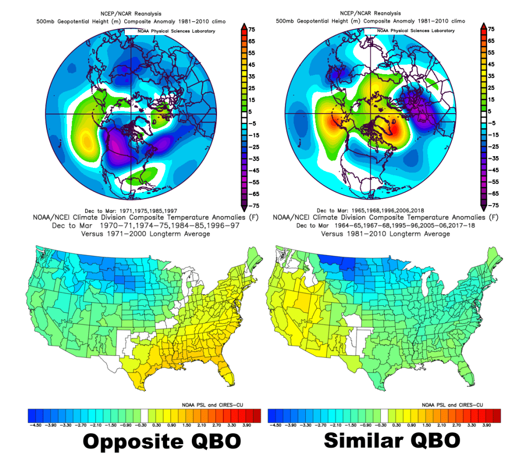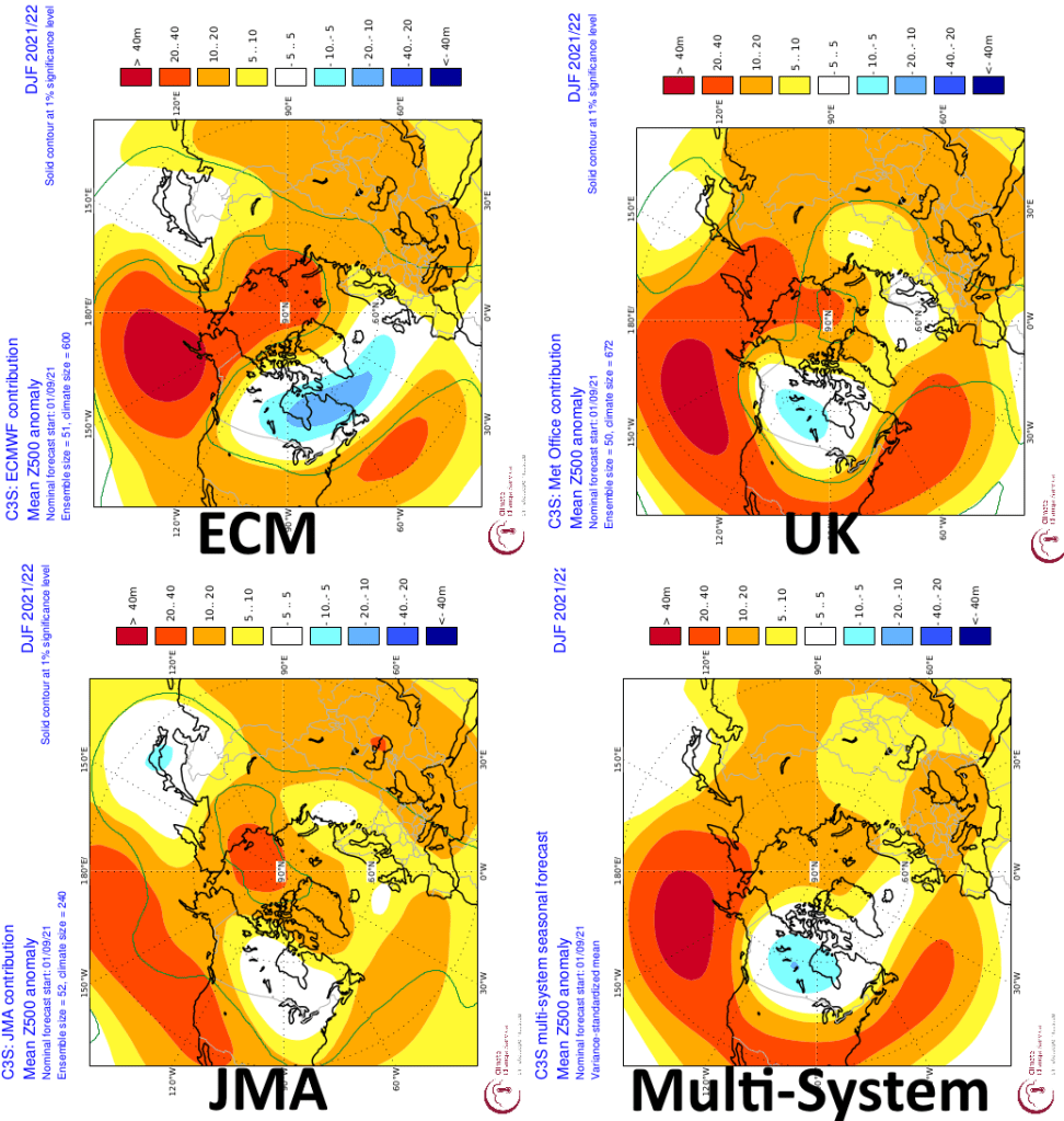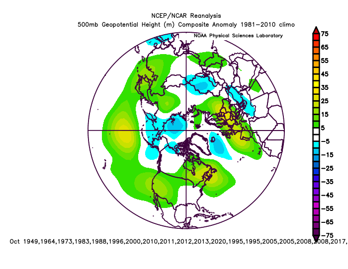 The 2m temperature forecasts suggest more trouble for the cooler air to push into the CONUS than the analogs imply…perhaps there’s a gradual trend towards that due to Hadley Cell expansion, but likely not this quick. Based on what similar 500mb patterns have done in past winters, outside of the UKMET which is closer to being more dangerous I think the 500mb patterns on the ECM, JMA, and overall multi-system mean are encouraging for a cold winter in the northern U.S. with some ridging over the Southwest and Southeast, with a gradient pattern in between. The UK depiction looks similar to weak-moderate La Ninas that have a more opposite QBO downwelling to this winter, which is interesting.