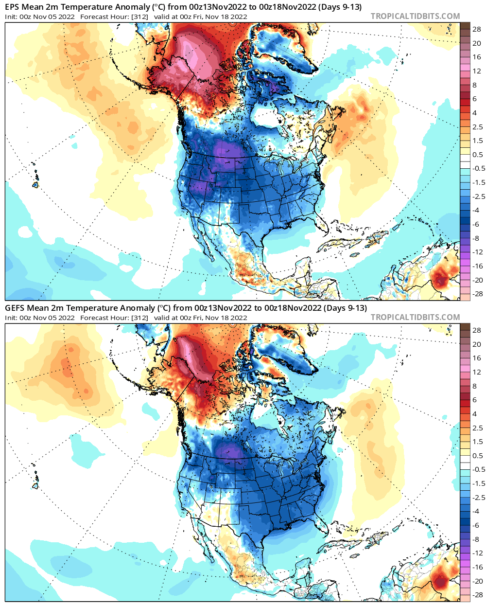 The 2m colder temperature anomalies, much like some of the other models, also struggle to push south into the CONUS compared to the analogs on the CFS.