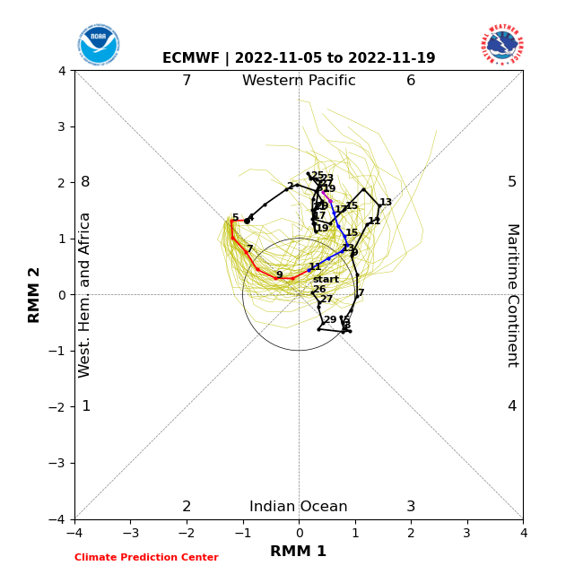 Tropical forcing is centered near 120E right now, registering as a phase 5 MJO, projected to move into phase 6 next week:
