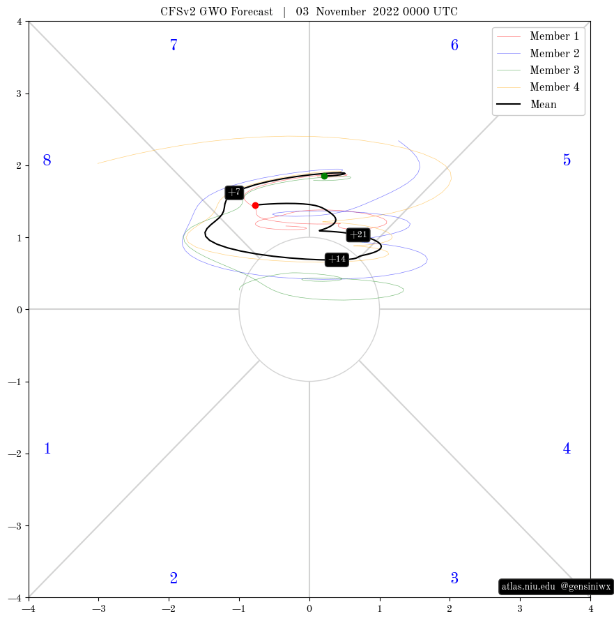 The EAMT is negative through about January 15th, supporting Pacific jet retraction and a -PNA. After that it begins trending more positively. You can see that low pressure appears to begin getting pushed towards the west coast of North America at the end of the loop due to the beginning of the jet extending. This may have a temporary effect of amplifying the West Coast trough in late January, but would eventually lead to a north Pacific pattern shakeup favoring a more positive PNA trend.