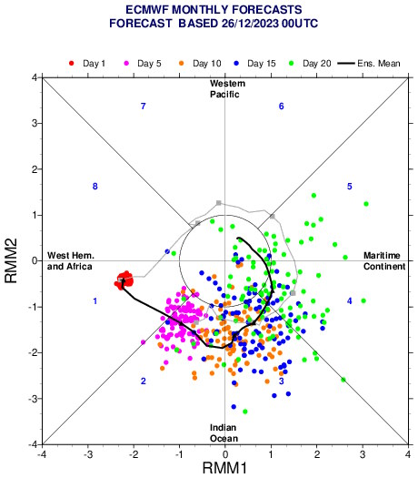 Tropical forcing passed through the western hemisphere and into Africa (phase 1-2 MJO) at the end of December/beginning of January:
