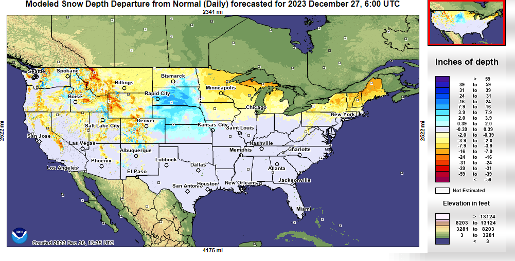 Not a surprise in a strong El Nino winter but December 2023 has been a very mild so far, with no significant cold anomalies expected in the continental U.S. (CONUS) the rest of the month to take much of the edge off of this map. While parts of the country have seen impactful winter weather, with Blizzard Warnings and Ice Storm Warnings posted across parts of the Plains and Upper Midwest as of this writing, it’s generally been a very slow start to winter across the Lower 48 and much of Canada. Current snow cover analysis reveals very limited snow cover across the CONUS at the end of December: