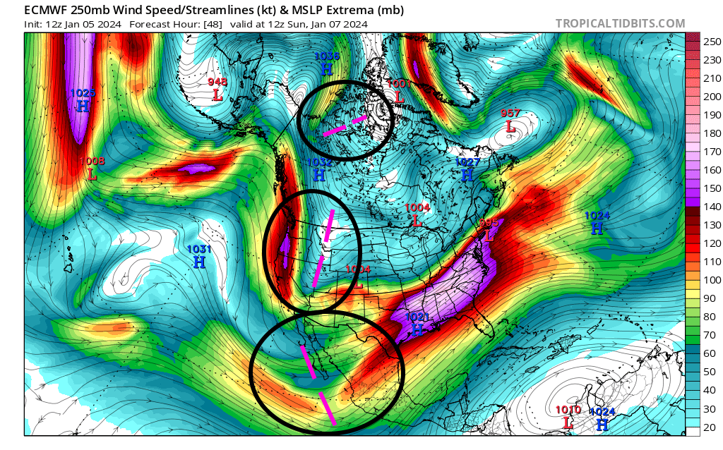 The strong +EAMT has led to the dramatic intensification of the north Pacific jet ongoing now, though the jet will begin retracting over the coming days and continue retracting/weakening into early January as EAMT trends more negative (and as tropical forcing changes, will get into that below). The stronger jet leads to stronger ageostrophic flow within its embedded jet streaks, encouraging a stormier (and amplified) pattern, especially near the eastern edge of the jet where the upper-level flow is most diffluent.