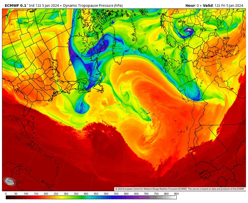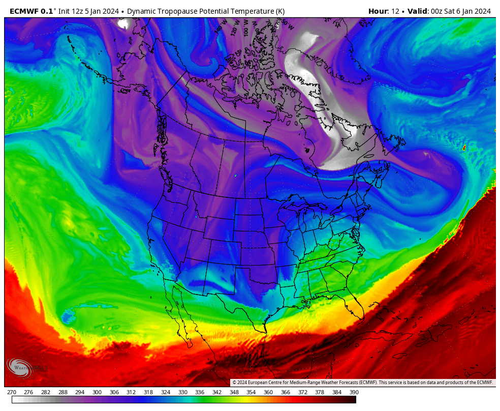 European model forecast dynamic tropopause potential temperature from January 6-11, courtesy WeatherBell