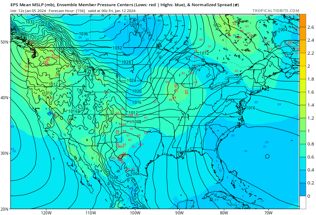 There are a number of EPS members that are stronger than the mean, though most are northwest of the mean, and the strongest ones are well northwest of the mean. This is evident on both the spread (all to the north/northwest of the mean) and map of the member low locations: