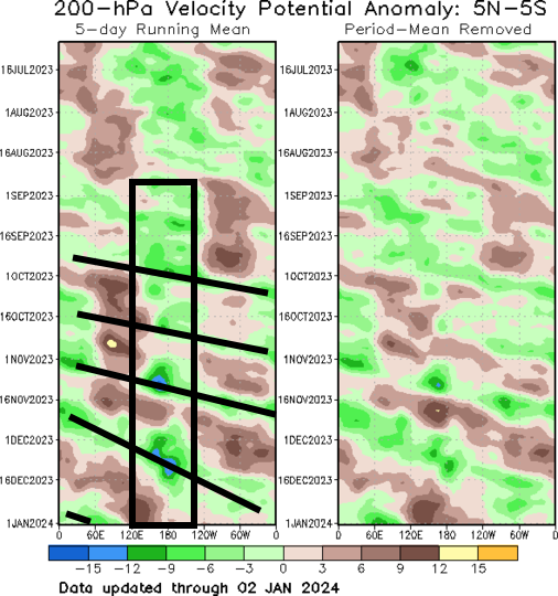 Observed 200mb velocity potential anomalies by longitude, courtesy the Climate Prediction Center/CPC