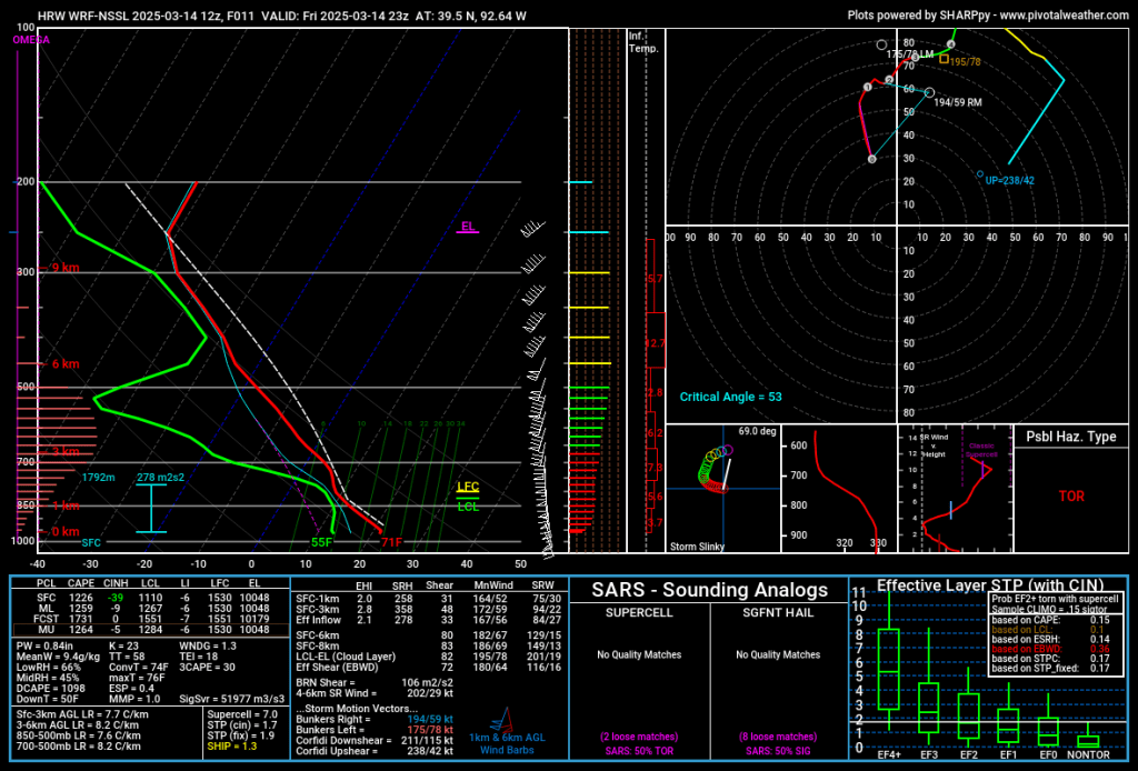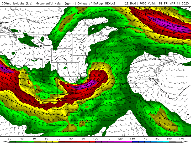 Something to keep in mind, the 500-700mb jet doesn’t really punch into the warm sector in the upper Mississippi Valley until after 0z…so, shear profiles will already be impressive this afternoon and will improve markedly after 0z…500mb: