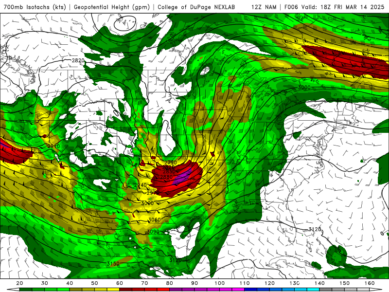700mb (which is roughly 3km, so think of your 0-3km bulk shear vector for bowing segments and mesovort tornado potential, along with your 0-3km SRH). Low-level shear will be strong in the warm sector this afternoon and explode starting right around 0z this evening: