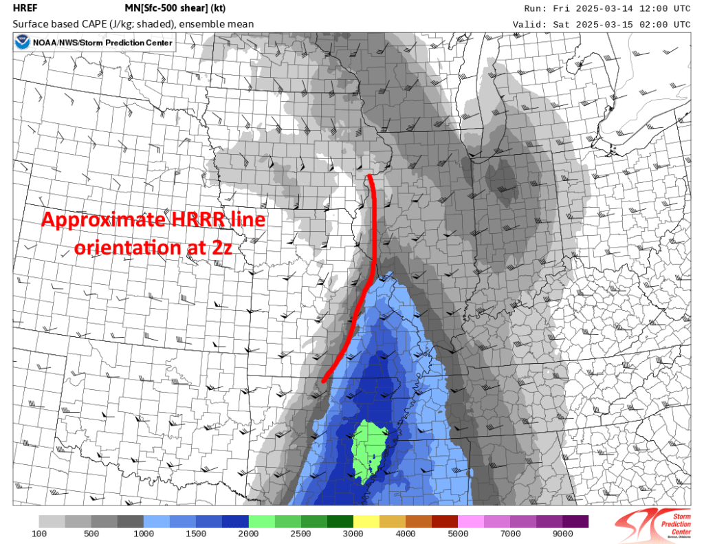 The strong forcing argues for quick upscale growth in MO, IA, and IL this afternoon and evening, and most of the CAMs above do have a more linear mode than cellular. However, most do have hints of a more semi-discrete mode from east-central MO across central/southern IL and perhaps into far west-central IN. It is in this area where for several hours after 0z the bulk shear vectors are oriented 30-45 degrees across the expected convective line, which does argue for right-moving cells. The forcing is also a bit weaker farther south, which could assist in maintaining a somewhat more discrete mode:
