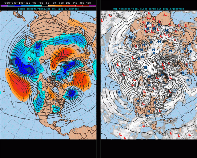 A current look at the northern hemisphere reveals that a transient 50/50 low is allowing enough cold air into the eastern US for a storm system approaching the Atlantic seaboard to produce a swath of light to moderate snow from the Washington DC region south into parts of the Carolinas. Elsewhere, ridging is building off the west coast of the US which is forcing a trough to develop over the western US. This ridging will continue to build off the west coast, leading to a trough developing over much of the western/central US over the coming days.