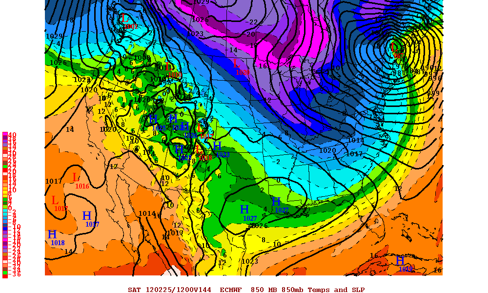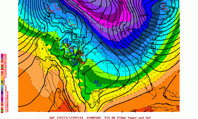 The best chance for any notable snows will come at the end of the week, when a piece of moist subtropical jet-stream energy, seen on the above image by the lower heights over the Baja of California, moves east and attempts to interact with the building trough and cold air over the Great Lakes.