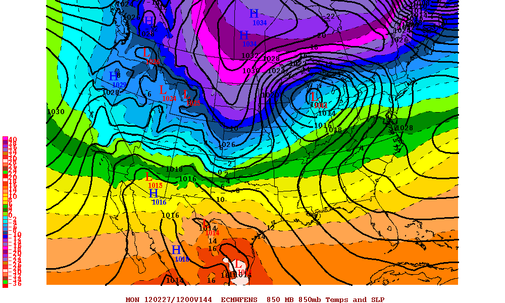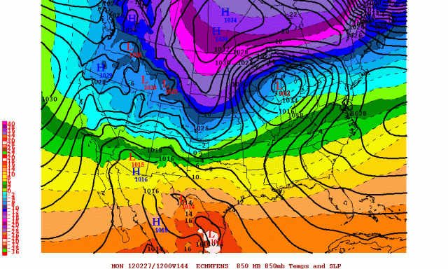 The above capture of the 12z European model (ECMWF) ensemble means shows what the landscape will look like following the weekend storm over the northeast US that has been discussed in previous posts. The weekend storm, by most accounts, will deepen significantly over southeastern Canada and temporarily raise heights over the Davis Strait, allowing for a transient psuedo -NAO and 50/50 low to form Sunday before the fast nature of the pattern forces the NAO to return to a positive state and heights to rise over the eastern US.
