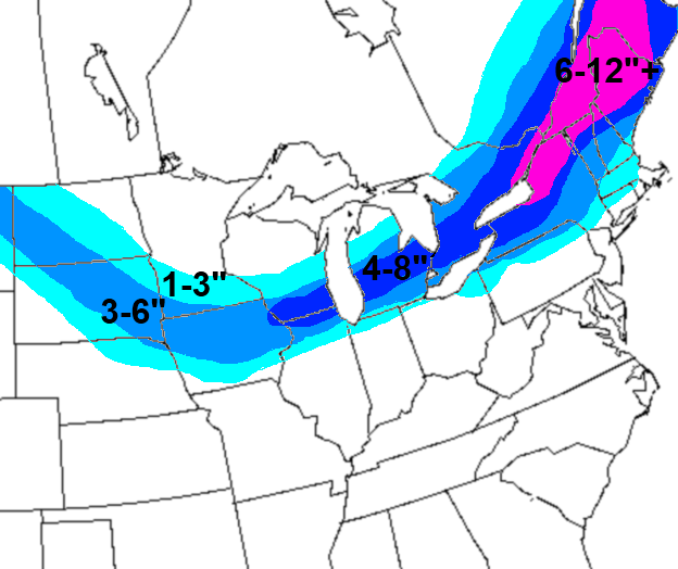For accumulations east of the Plains, given the 12 hour +/- duration of snow over IA/northern IL/WI, with a burst of moderate to heavy snow likely, will go with a 3-6” of snow where I believe precip will fall as all snow. Farther east, dynamics will improve, duration will improve somewhat especially as overrunning precip becomes more widespread ahead of the storm, and a good portion of the snow will fall as night…therefore, will slightly broaden the swath of heavier snow and increase max amounts to 8”. The bullseye will likely be over the eastern lakes east into southern Ontario and Quebec, where locally 10” will be possible.