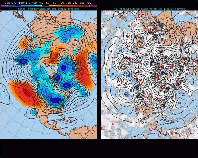 Given the current lack of any blocking on our side of the hemisphere, I believe the less amplified (and thus further south) storm track is more likely…in addition, current observations indicate that today’s GFS/NAM runs are a bit too fast with the low pressure.