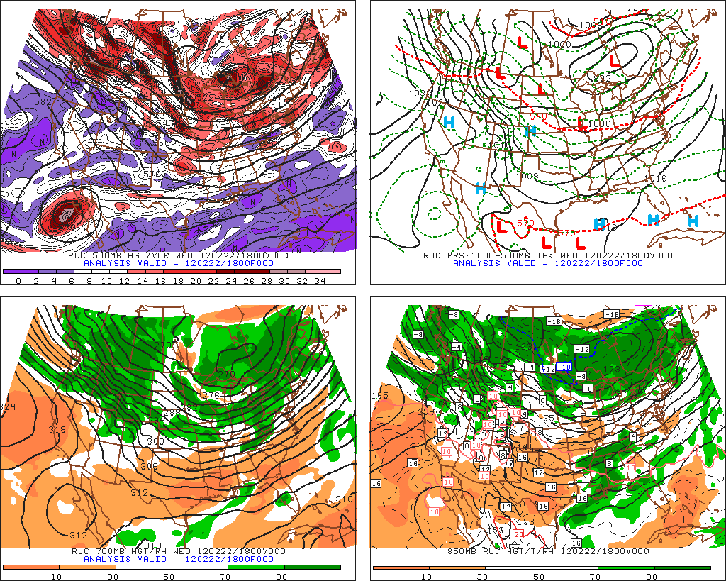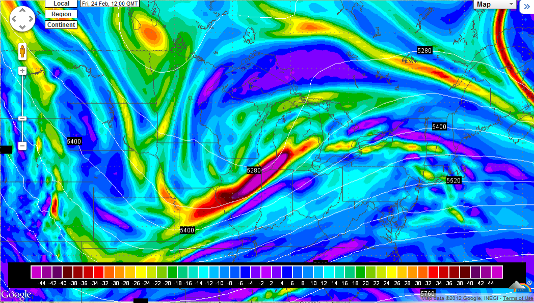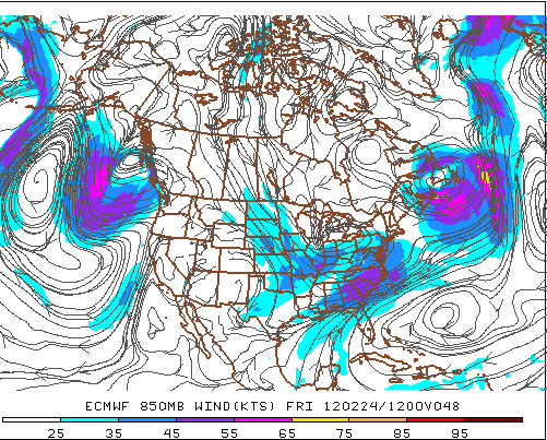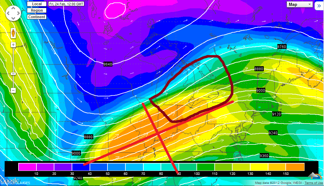 To illustrate the upper level divergence created by the jet streak associated with the storm, note the Euro model valid for Friday morning with the quadrants of the upper level jet streak drawn on…also, note how the height lines spread out in the left-exit portion of the jet streak, representing upper level divergence which encourages large scale lift under that portion of the jet streak.