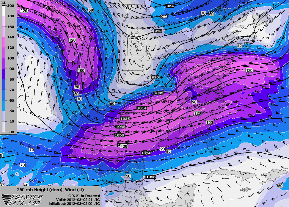 By mid afternoon a 100+kt 500mb jet streak will begin nosing over the warm sector from TN points north…and an outstanding dual upper level jet structure will exist in this same area with 120-140kt jet streaks providing outstanding large scale lift: