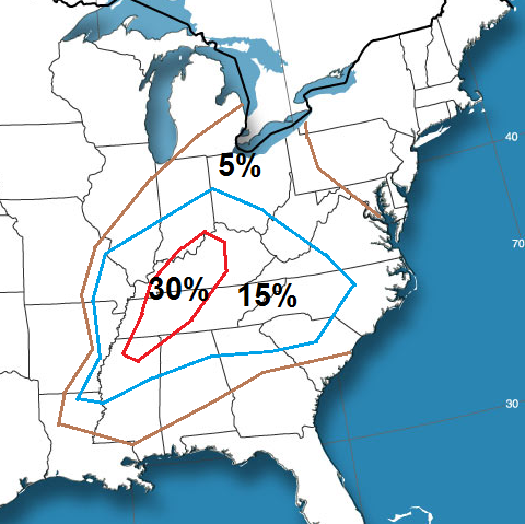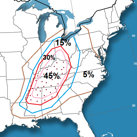 Will go with a moderate risk for tornadoes across the central and lower Ohio Valley into the TN Valley given good potential for supercells. Given very large hodographs and expected instability in these areas a few strong/long track tornadoes will be possible, however given some questions about capping and updraft intensity given decent EML to try to punch through will not go with high probabilities.