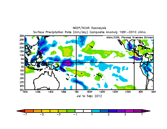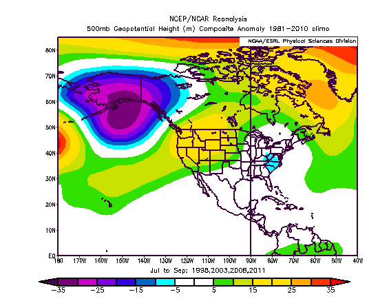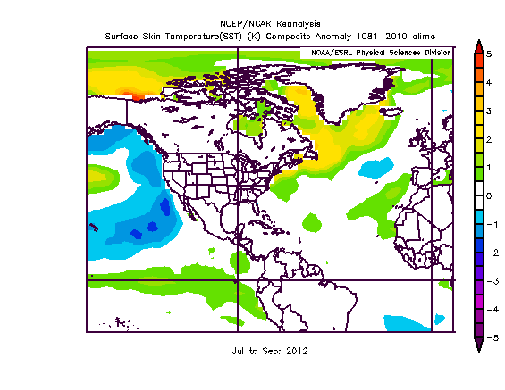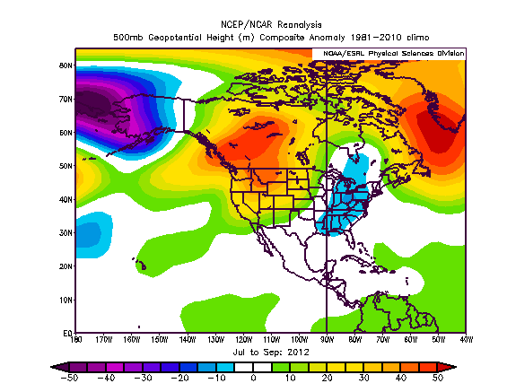 Above is a look at the JAS 2012 pattern across North America. Some key features to point out are strong Greenland blocking leading to a trough over the eastern US, along with lower than normal heights between Alaska and Siberia leading to ridging over western North America.