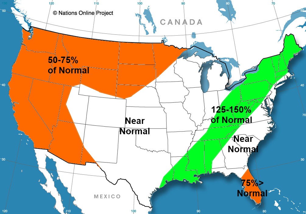 This year’s map does not quite look like the above map. There was above normal precip east of the dateline along the equator, but not as much as in the JAS periods leading up to previous strongly –NAO winters. There was also above normal precip west of the dateline, which did not occur in the previously strong –NAO winters. There was an area of below normal precip stretching from the Central American coastline east towards Hawaii, which also occurred in the JAS periods leading up to –NAO winters. Overall, this variable does not conclusively point to a negative or positive NAO winter this winter.
