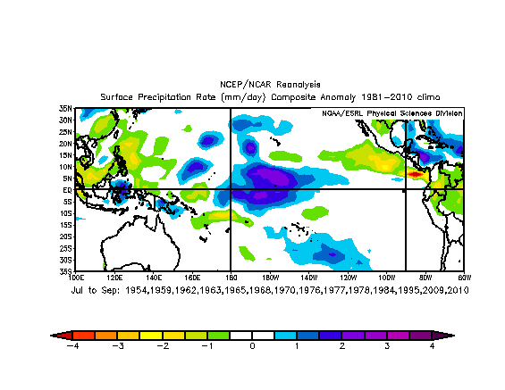 In the same years used in the Atlantic Sea Surface Temperature section above for –NAO years here is what the precipitation rate looked like in the JAS period leading up to the above used –NAO years. Note the large area of above normal precip along the equator just east of the dateline: