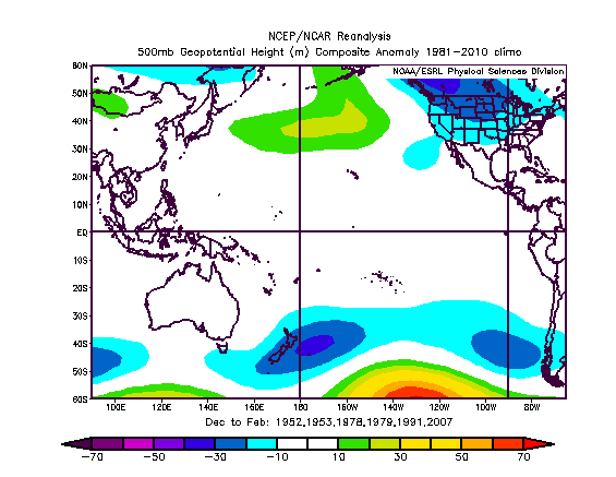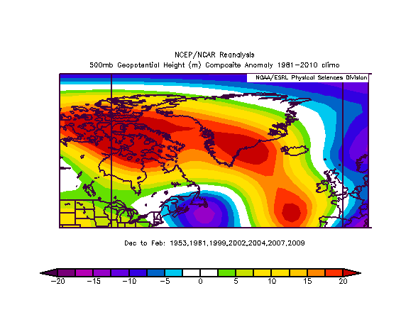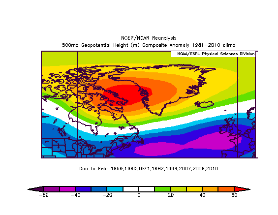 The 500mb height anomalies over the NAO region the following winters, on average, looked like this: