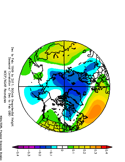 The correlation for a +QBO in the winter months (1949-2011) shows that in general, when the QBO is in its positive, or westerly phase, that lower than normal heights tend to persist over the high latitudes, meaning the high-latitude blocking is generally less likely during a +/westerly QBO than a -/easterly QBO.