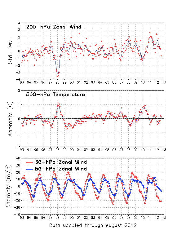 Given the zonal wind anomalies continue to be strongly easterly, with down-welling evident as the 200mb zonal wind anomalies begin to decrease, along with the tropical 500mb temperatures increasing, it is a fairly good bet that winter 2012-13 will feature a –QBO…possibly strongly…which may favor high latitude blocking.