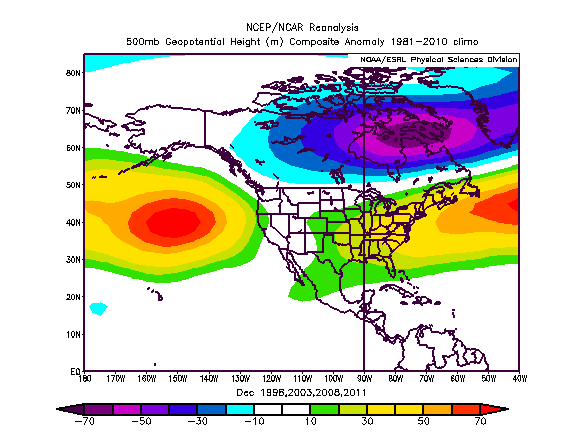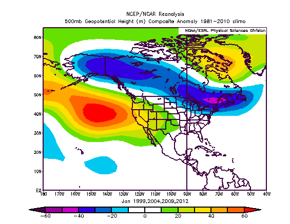 The pattern shown is interesting but in general matches –PDO climo…with a negative PNA and resulting troughiness over the western/central US. It should be noted that there are only limited signs of an enhanced sub-tropical jet in the above composite image, with the only signal being a negative anomaly off the SW coast of the US. This points to a more active polar jet than normal with a slightly perkier subtropical jet in the analog years. Precipitation anomalies in these years did show slightly above normal precip across the southern/eastern US these years in all three winter months. It should be noted that for the above image, I was ONLY considering Pacific sea surface temperatures, and it is only one variable being looked at for this composite map. When looking at the month by month breakdown, the troughing was focused in the western and central US in December and January, and farther east in February.