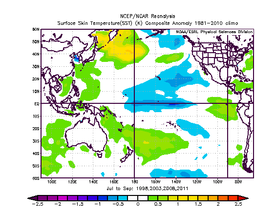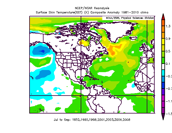 In general, the analogs, based strictly on the proceeding JAS period indicate that high latitude blocking is more likely in January than February in the roll forward analog years…there is also some ridging off the west coast of the US in each month of the analog years. However, the sample size is extremely small, and the Pacific in general this year does not match the JAS “analogs”…here was the JAS Pacific SSTs those years: